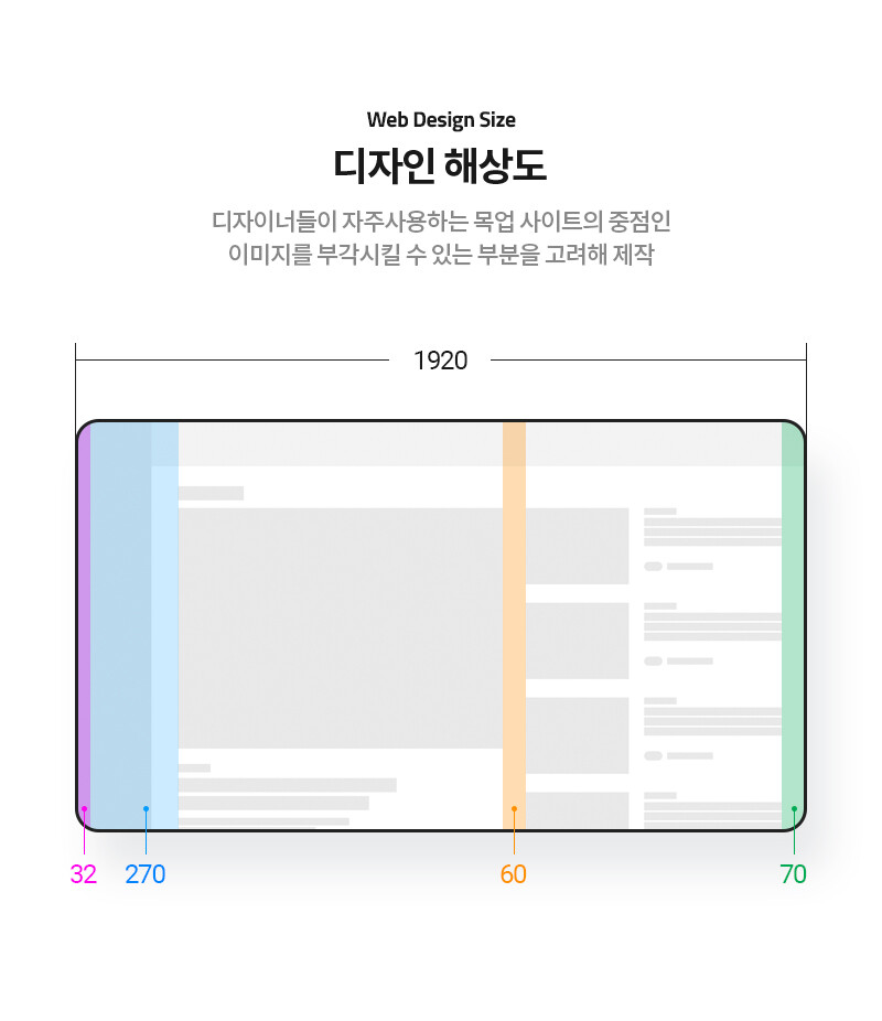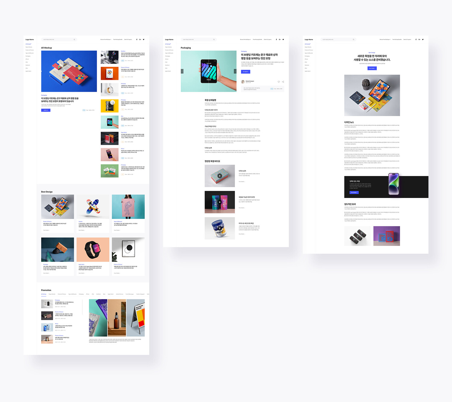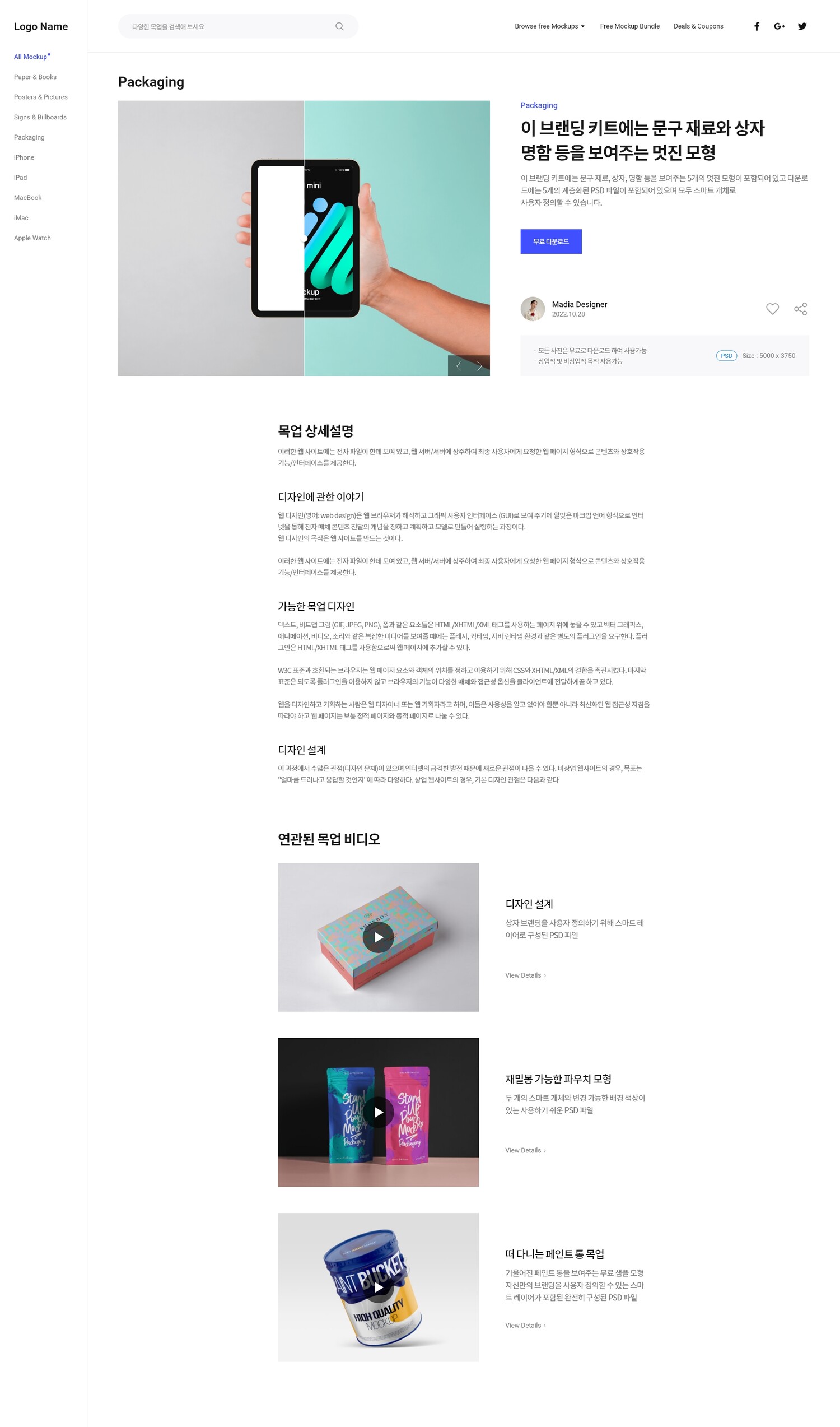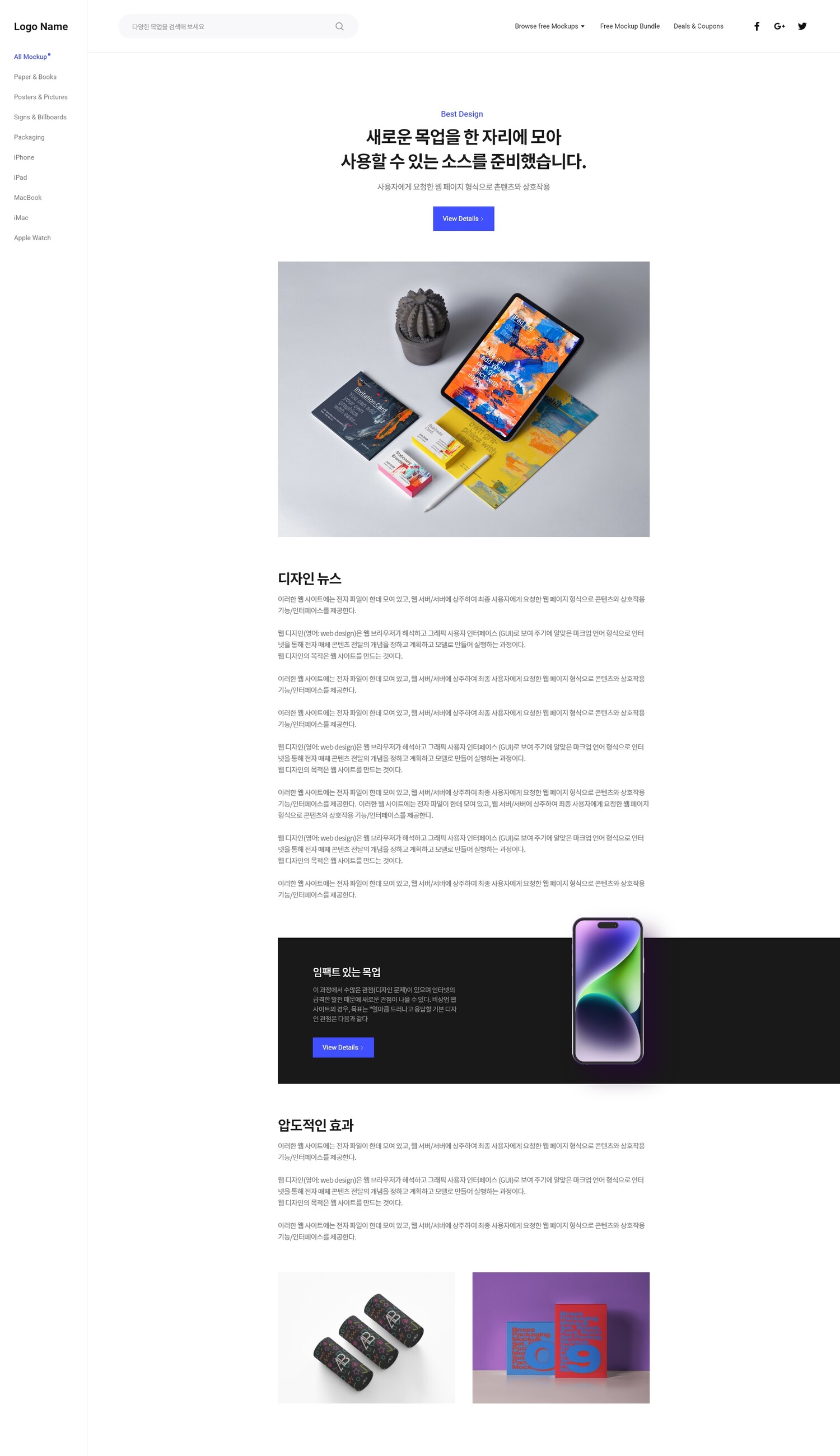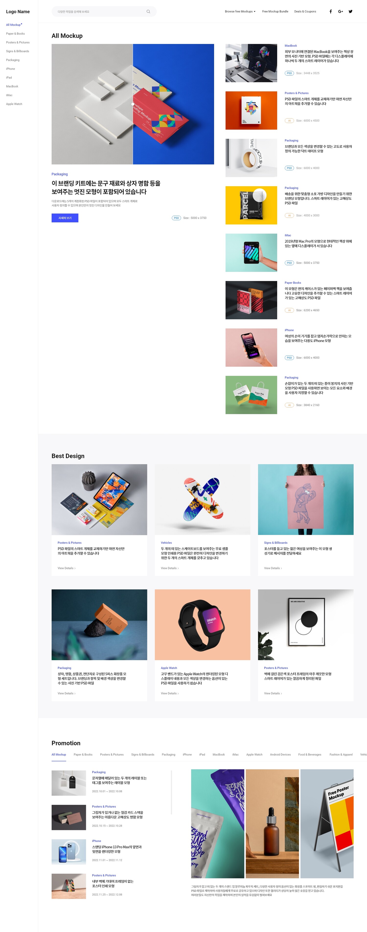 디자이너들이 사용하는 목업 사이트의 콘셉트 디자인이며 목업에 걸맞은 이미지 중심의 레이아웃 배치와 시선을 분산시키지 않는 간결함으로 디자인한 것이 특징