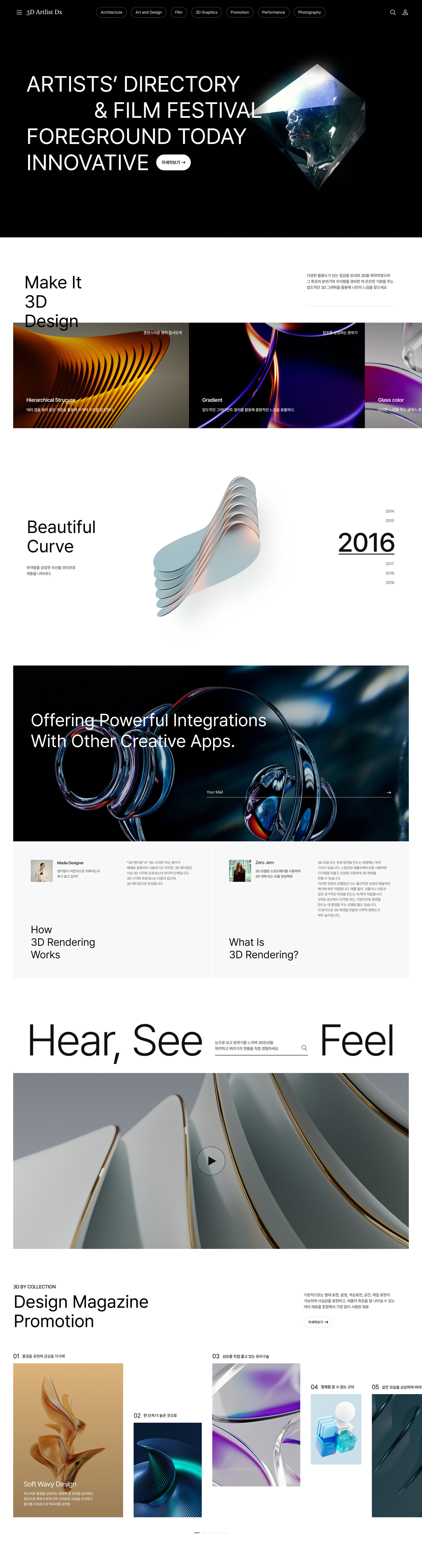 강렬한 3D이미지를 적극 활용하여 넓은 여백과 과감한 폰트의 계층으로 진행한 UI 디자인으로 시선의 흐름을 사용자에게 전달하는 것이 특징