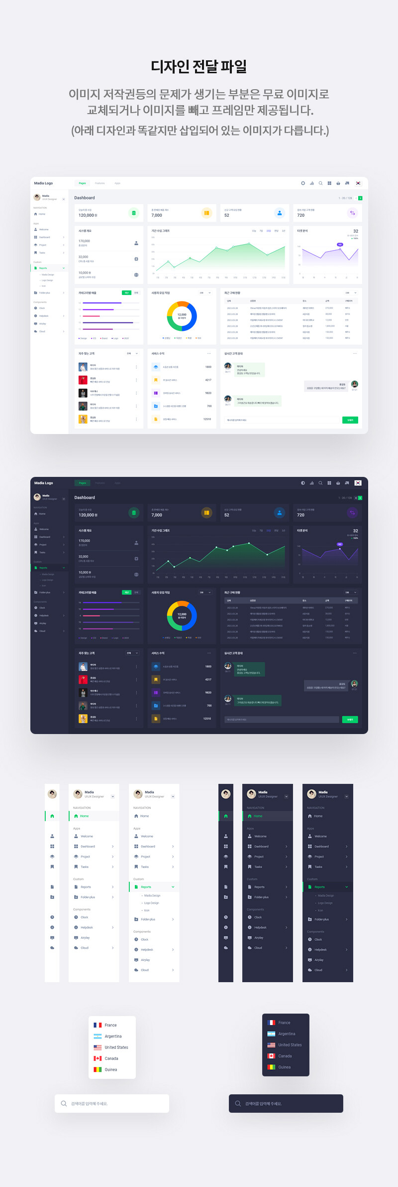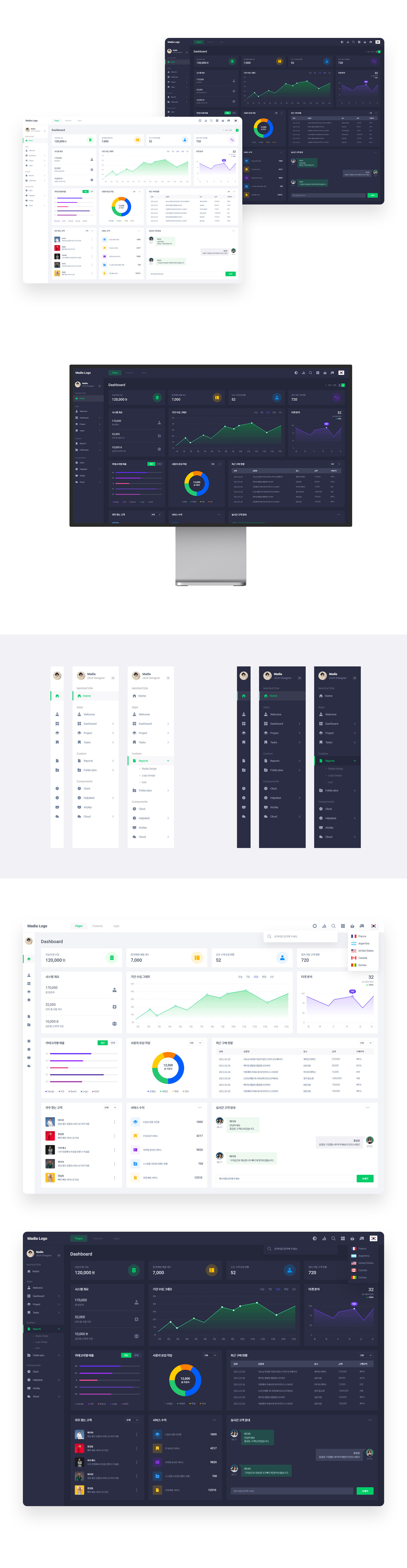 대시보드의 특성상 많은 정보를 나타내고 있어 그리드 방식과 모듈형 UI로 진행했으며 다크, 화이트 모드를 둘 다 재공 하고 있는 것이 특징이다.